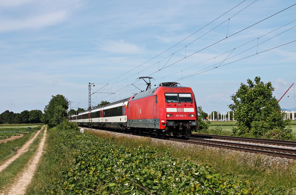 Mit dem ersten EC 9 (Hamburg Altona - Zürich HB) nach den Grenzöffnungen des ersten Corona-Lockdowns, fuhr am Nachmittag des 26.05.2020 die 101 145-1 südlich von Buggingen über die Rheintalbahn in Richtung Schweiz.