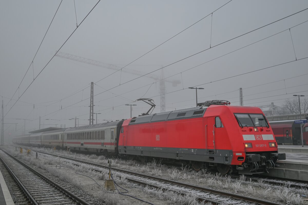 101 087 erreicht mit ihrem RE/IC 2082 Berchtesgaden - Hamburg den Bahnhof Freilassing am 30.12.2024