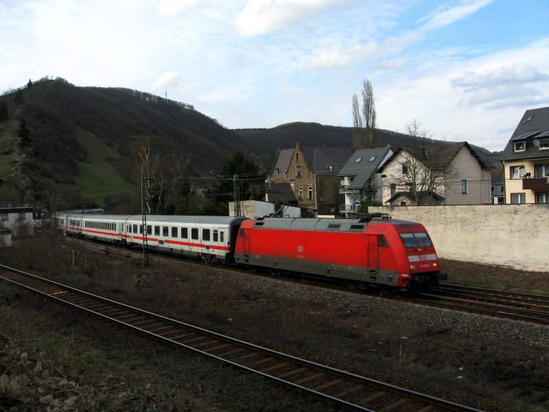 Eigentlich nicht mehr als ein SiBi, aber ich wollte es euch doch mal präsentieren. 101 039 ist am 28.03.2008 mit IC 2115 bei Boppard gen Süden unterwegs.
