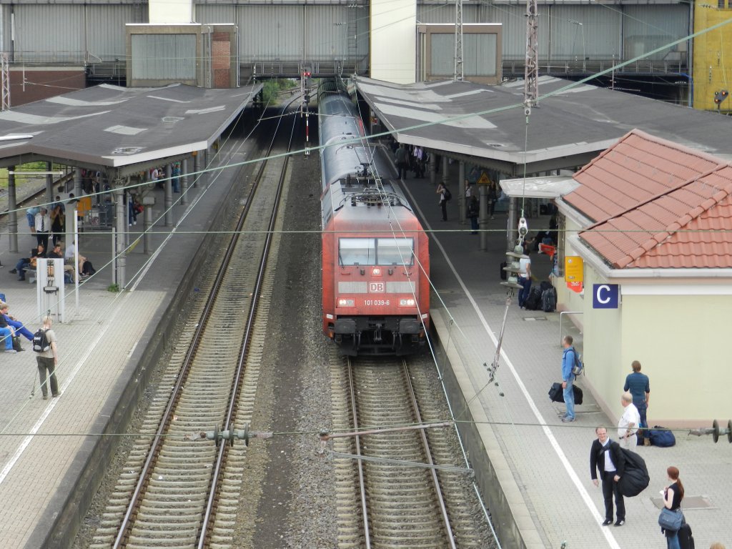 Am vorletzten Tag vor dem Fahrplanwechsel, dem 12.12. 2025, befördert die 101 002-4 den EC 9 in Düsseldorf Wehrhahn in Richtung Süden