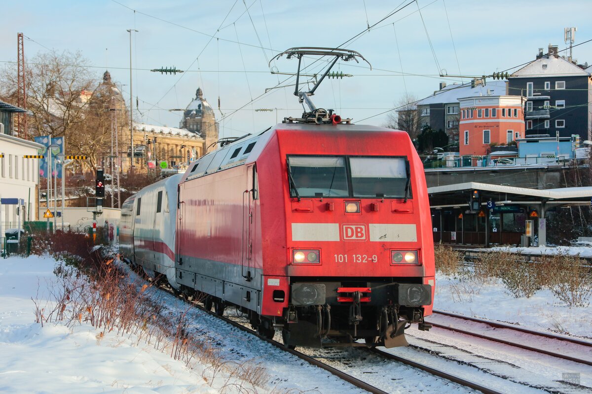 DB 101 132-9 mit DB ICE 402 022 in Wuppertal, Januar 2026.