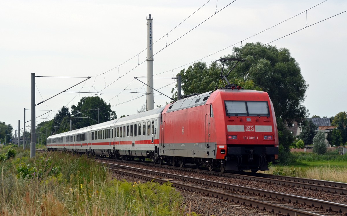 101 089 schob am 01.08.15 einen wegen Bauarbeiten über Dessau umgeleiteten IC durch Jeßnitz Richtung Bitterfeld.