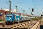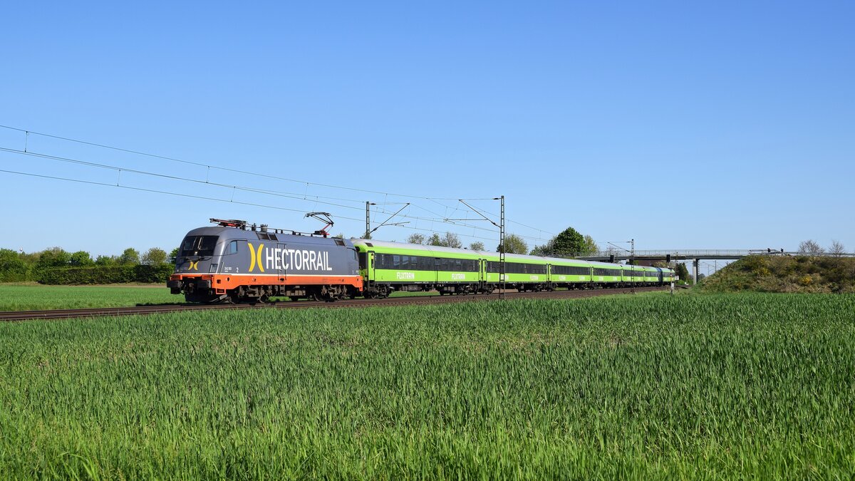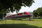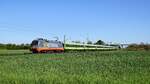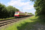 Mit der Ersatzlok 101001-6 als Vorspann für die defekte dahinter laufende 103245 kam am 18.6.2025 der AKE Rheingold über die Rollbahn zurück. Um 16.00 Uhr war der Zug am Rand von Tecklenburg kurz vor dem Lengericher Tunnel unterwegs. Als aktive Schublok war noch die CD Lok 393001 dabei, die hier in weiter Ferne noch nicht zu erkennen ist.