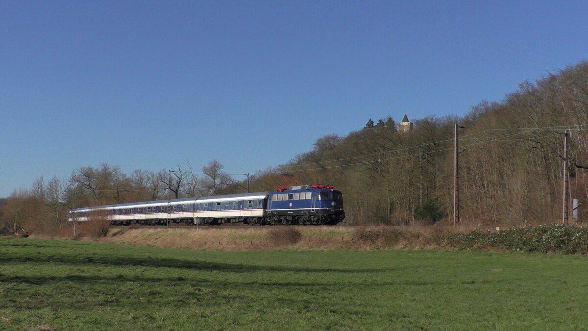 TRI 110 428-0 zieht am 27.02.2022 ihren RB40-Ersatzzug von Essen Hbf nach Hagen Hbf. Hier ist die Bügelfalte zwischen Witten und Wetter(Ruhr) unterwegs.