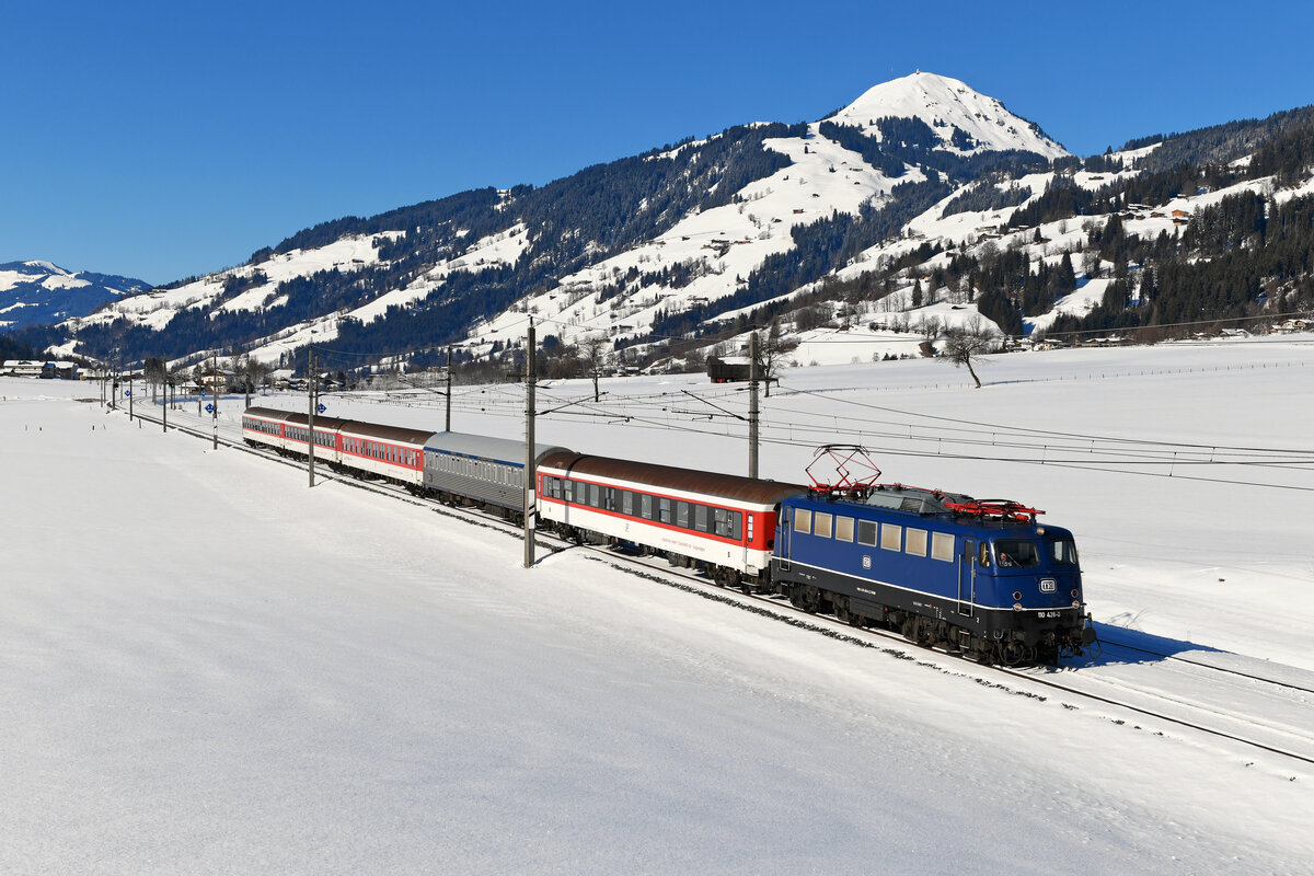 Zur Freude vieler Eisenbahnfreunde bespannte am 12. Februar 2022 die mustergültig gepflegte 110 428 von TRI den Alpen-Express ab Venlo. In Wörgl wurde der Zug dann geteilt. Die blaue Bügelfalte übernahm hierbei den Zugteil nach Bischofshofen. Wie so oft entwickelte sich das Warten auf den Zug als ziemliches Geduldspiel. Mit über zwei Stunden Verspätung erreichte der DRV 13489 gerade noch rechtzeitig meinen Fotostandpunkt bei Brixen im Thale - die Sonnenstand wäre sonst nicht mehr optimal gewesen. Die frisch verschneite Hohe Salve im Hintergrund bildete den angemessenen Hintergrund für diesen klassischen Turnuszug. Man fühlt sich in längst vergangene Zeiten zurück versetzt, als die es zum Standardgeschäft der Baureihe 110 gehörte, Schizüge auf der Giselabahn zu befördern.