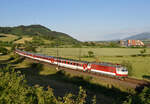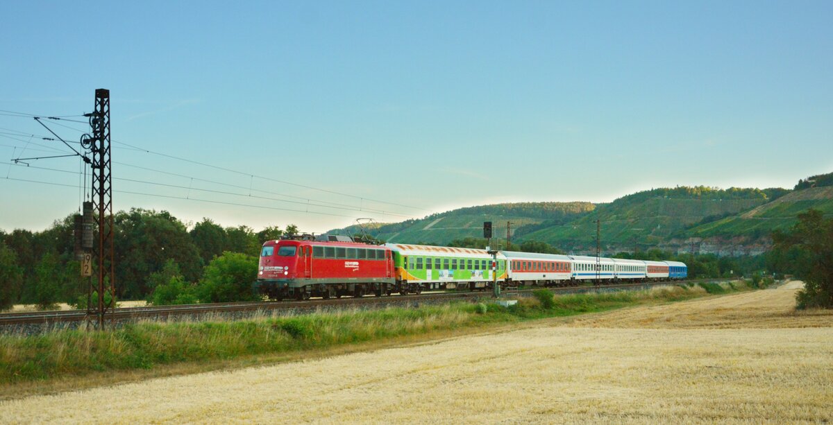 Der ALPEN-SYLT Nachtexpress (RDC Deutschland, NEx 1312 Westerland/Sylt – Salzburg) am 17.07.2022, gezogen von BTE 110 491-8, kurz vor Sonnenaufgang bei Himmelstadt im Maintal.