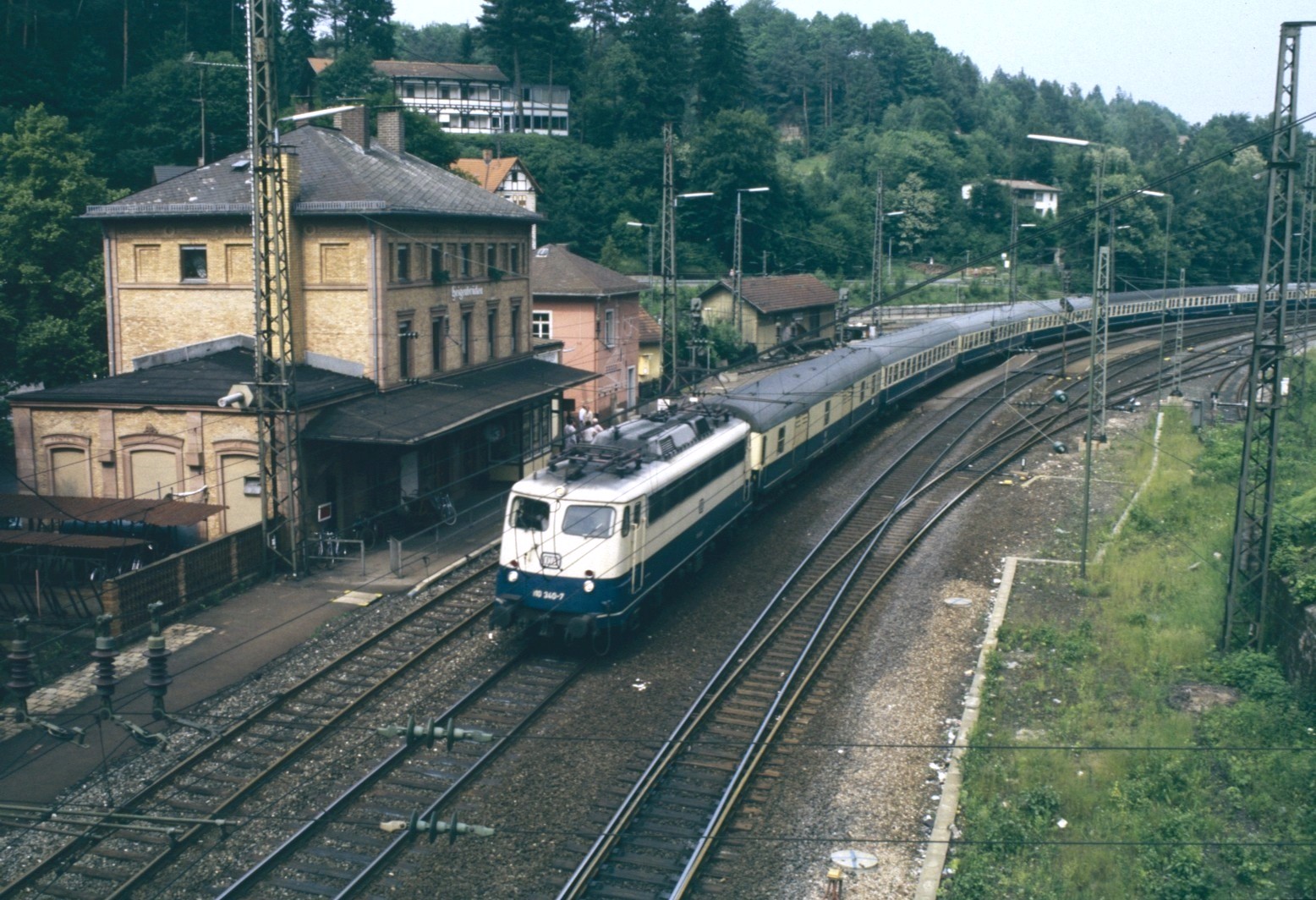 DB 110 340-7 (Bw Frankfurt (Main) 1) mit D 720 (Passau-Dortmund) bei Heigenbrücken im Spessart auf dem Weg nach Aschaffenburg am 18. Juni 1986.