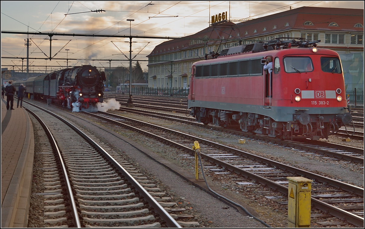 Fuzzies überall. Ein Dampfer bringt selbst den Oldtimerfahrer zum Fuzzen. 01 1066 und 115 383-3 in Singen. März 2015.
