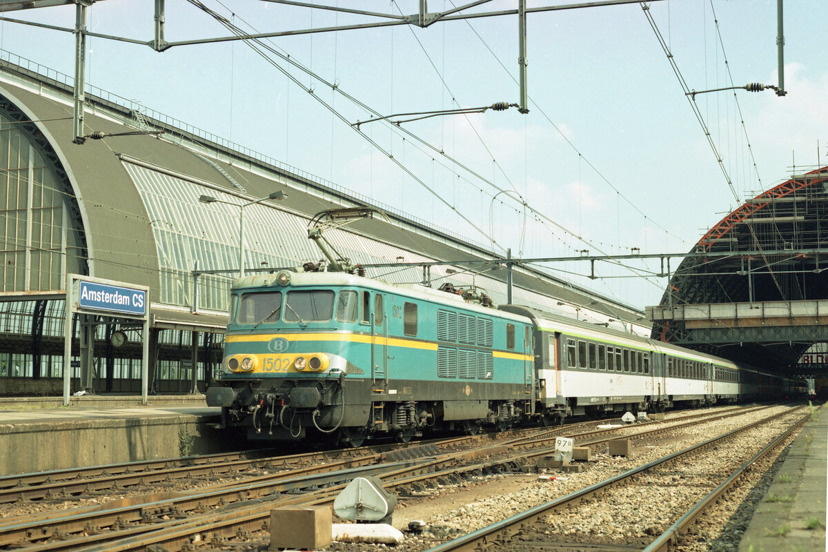 Abfahrt des Internationalen Schnellzuges nach Frankreich, aus Wagen typ Corail der SNCF und Elok 1502 der NMBS. Amsterdam CS, am 29.07.1984. Scan (Kodak Vericolor III).
