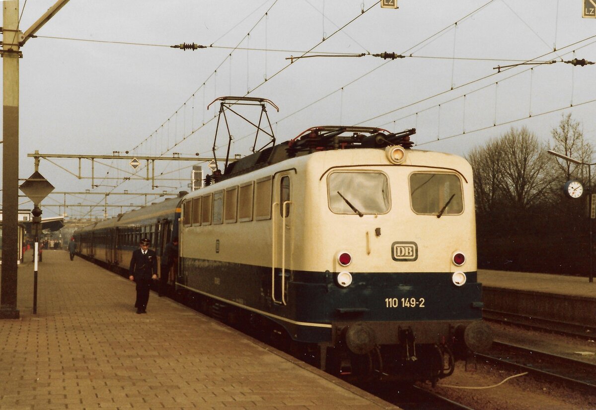 DB 110 149-2 mit gerade angekoppelten NS-Wagen als IC 2505 nach Köln in Venlo am 4. März 1983.