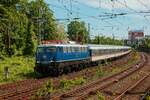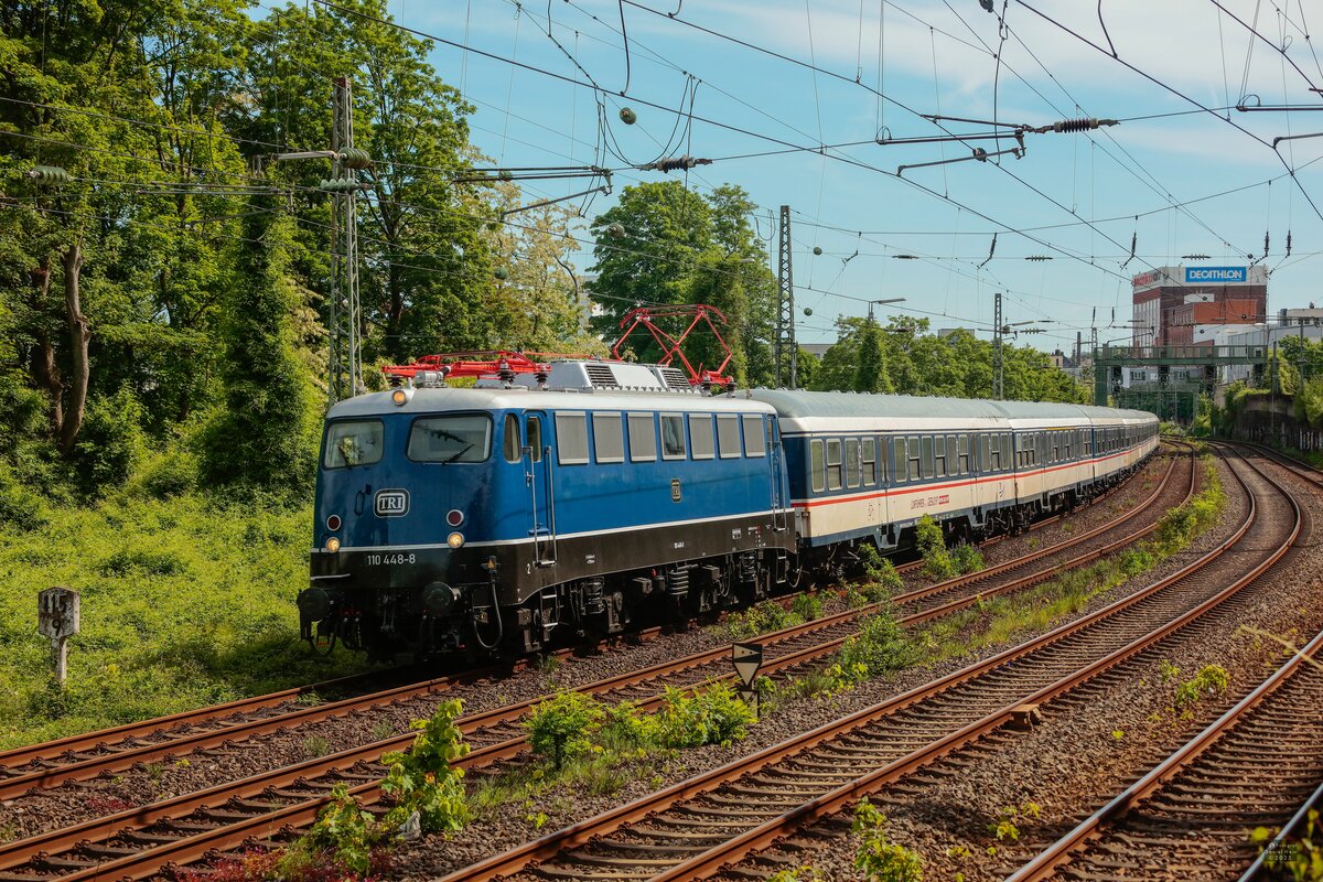 Noch einmal im letzten Abendlicht: 110 469-4 (TRI - "Elefantenexpress, 50 Jahre Maus") mit dem RE3 in Richtung Hamm Hbf in Castrop-Rauxel, 17. Februar 2025
