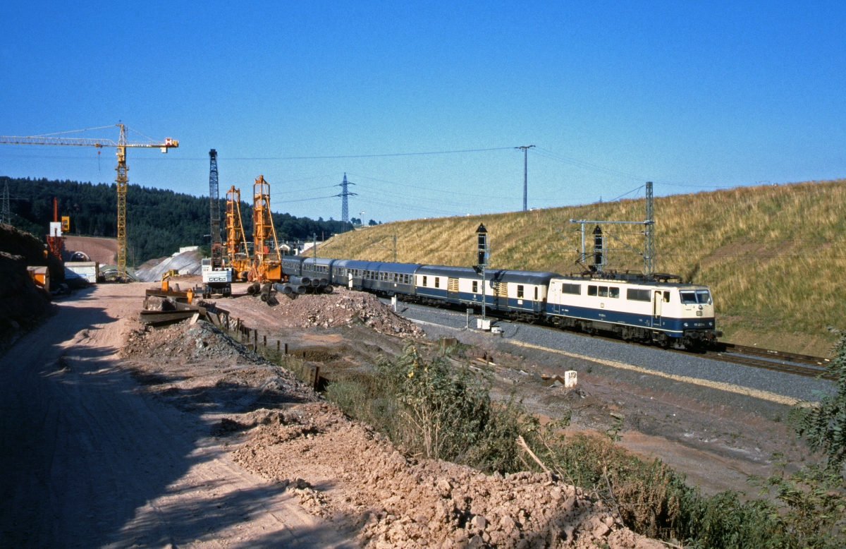 111 223 mit Eilzug bei Fulda während der SFS-Bauarbeiten (3.8.1986):