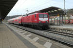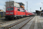 DB 111 087 mit RE 2 (4859) Hof - München in Regensburg, 20.02.2026. Im Hintergrund ein wegen vereister Wagen  verendeter  ALEX.