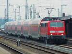 Am 04.04.2023 werden die Wagen des RE 5 / 4213 von 111 125 von Stuttgart nach Friedrichshafen gezogen. Aufnahme vom Ende das Bahnsteigs des Bahnhofs Biberach (Riß).