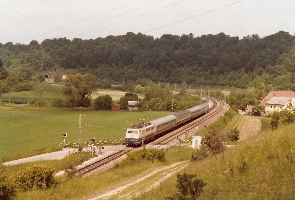 DB 111 005-5 (Bw München 1) mit einem Eilzug in Hagenacker im Altmühltal am 14. Juni 1984.