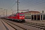 DB 111 087 mit RE 2 (4859) Hof - München in Regensburg, 20.02.2026. Im Hintergrund ein wegen vereister Wagen  verendeter  ALEX.