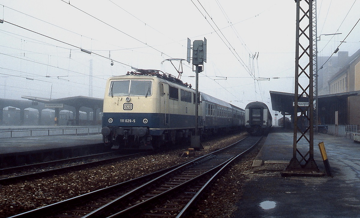 Langsam lichtet sich der Morgennebel, als 111 029-5 Anfang April 1989 den Bahnhof Donauwörth verlässt