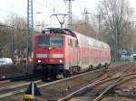 DB 111 087 mit RE 2 (4859) Hof - München in Regensburg, 20.02.2026. Im Hintergrund ein wegen vereister Wagen "verendeter" ALEX.