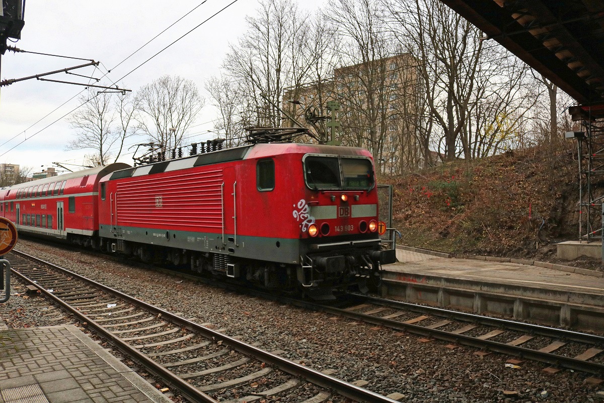 143 903 der S-Bahn Mitteldeutschland (DB Regio Südost) als S 37739 (S7) von Halle-Nietleben nach Halle(Saale)Hbf Gl. 13a erreicht den Hp Halle Zscherbener Straße abweichend auf Gleis 1. [24.12.2017 | 13:55 Uhr]