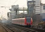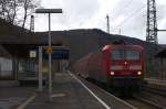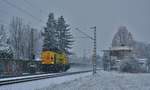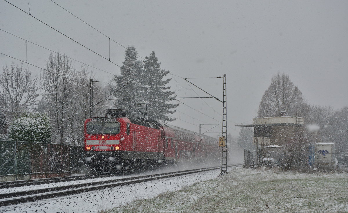 Bei starkem Schneefall zieht 143 568-4 die RB27 durch Grevenbroich Richtung Köln. Soeben hat sie das alte Stellwerk Ef Erftwerk passiert.
