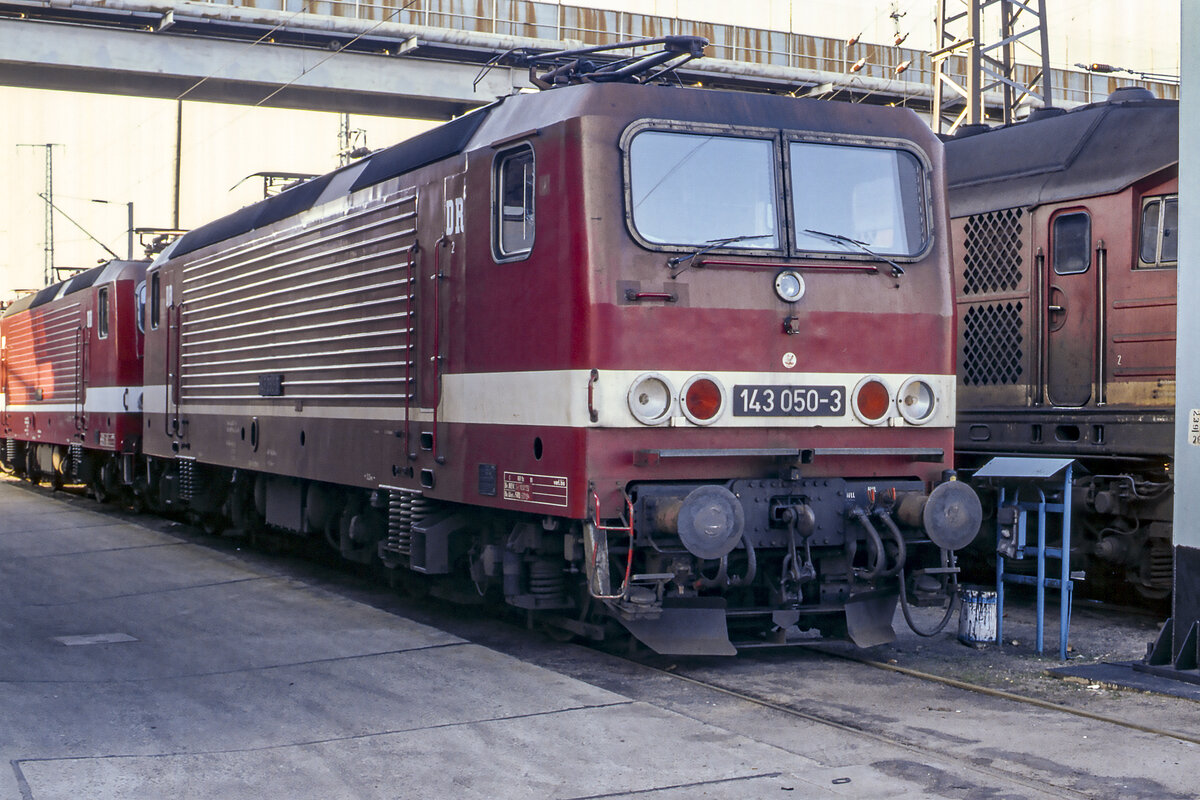 3.4.1994 - Stralsund - DR BR 143 050 wartet auf den nächsten Einsatz (Bild vom Dia)