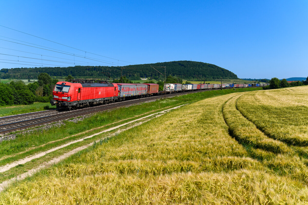 Nachschuss auf 2 Loks der Baureihe 143. (Die vordere Lok war 143 348-1, die hintere 143 138-6) Sie ziehen einen Ganzzug aus Kesselwagen in Richtung Ansbach. Aufgenommen am 05.08.2022 in der Nähe von Triesdorf