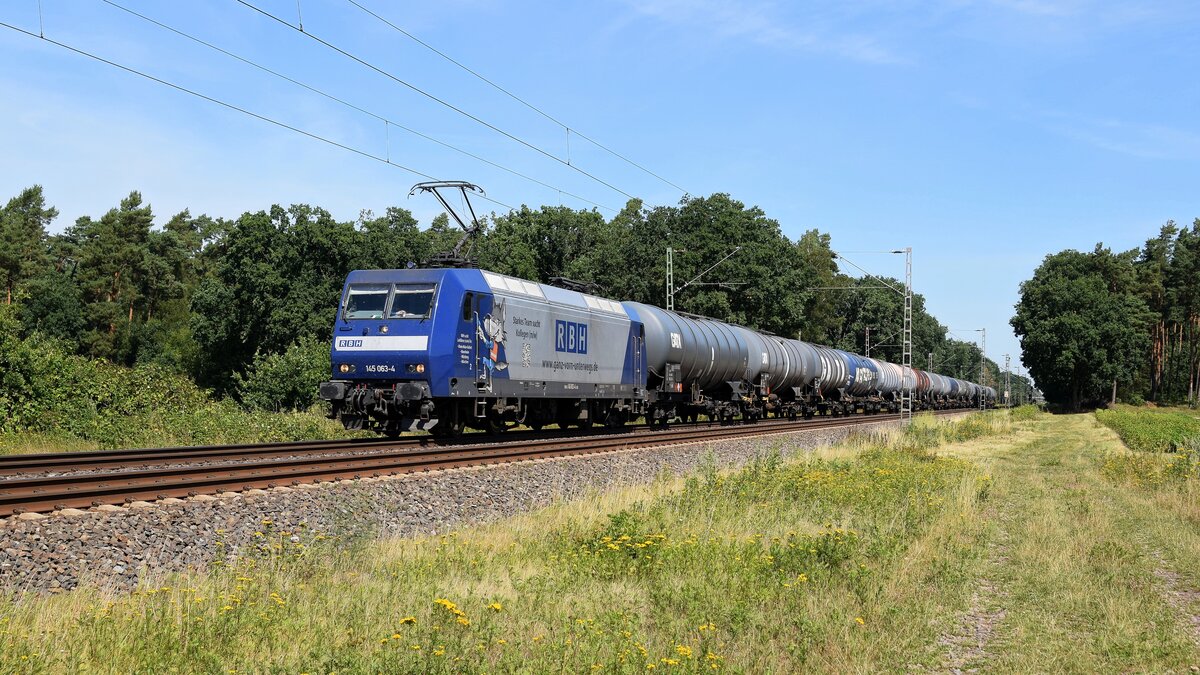 DB Cargo 145 063 "Starkes Team sucht Kollegen (m/w)", vermietet an RBH Logistics, mit Kesselwagenzug in Richtung Hannover (Rohrsen, 02.08.2022).