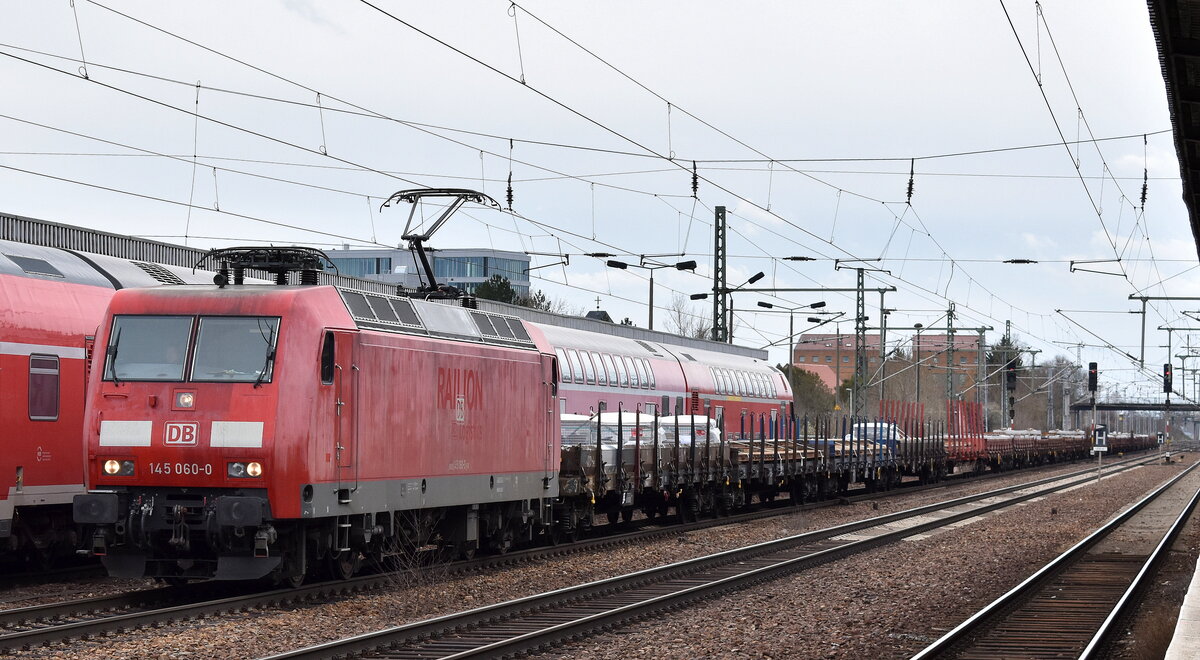 DB Cargo AG [D] mit ihrer "145 060-0" [NVR-Nummer: 91 80 6145 060-0 D-DB] und einem Güterzug Drehgestell-Flachwagen mit Baumaterialien zum Gleisbau am 23.03.23 Durchfahrt Bahnhof Flughafen BER Terminal 5