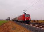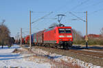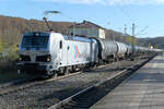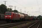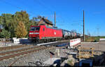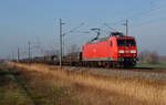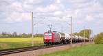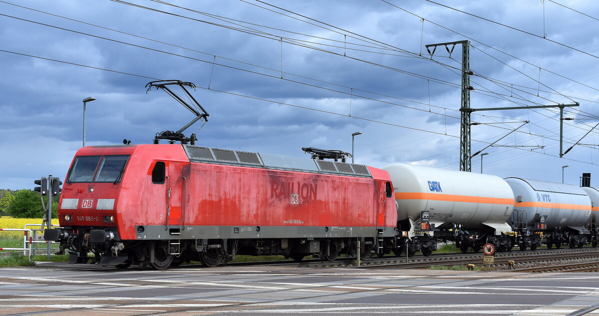 DB Cargo AG, Mainz mit ihrer "145 060-0" [NVR-Nummer: 91 80 6145 060-0 D-DB] und einem Ganzzug Druckgaskesselwagen (Vinylchlorid, stabilisiert) am 18.04.24 Höhe Bahnhof Rodleben.