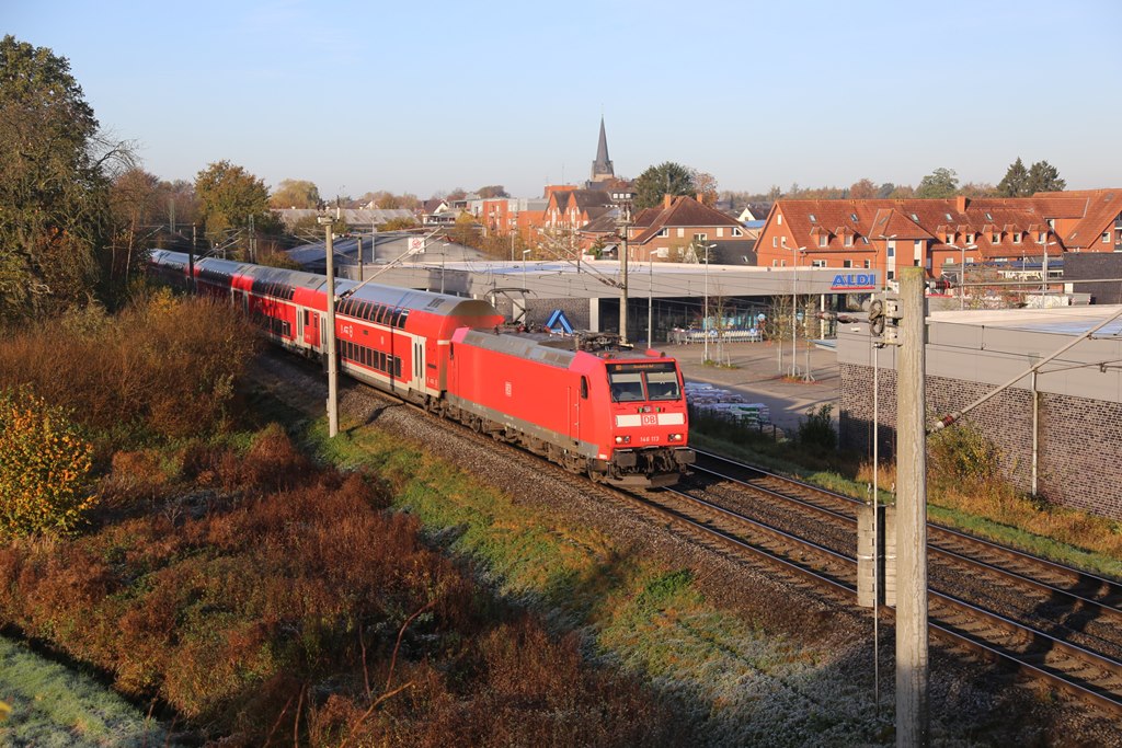 DER RE 2 mit Zuglok 146120 ist hier aus Düsseldorf kommend am 5.7.2025 um 9.10 Uhr bei Osnabrück - Hellern zum Endbahnhof Osnabrück HBF unterwegs. Gerd Hahn