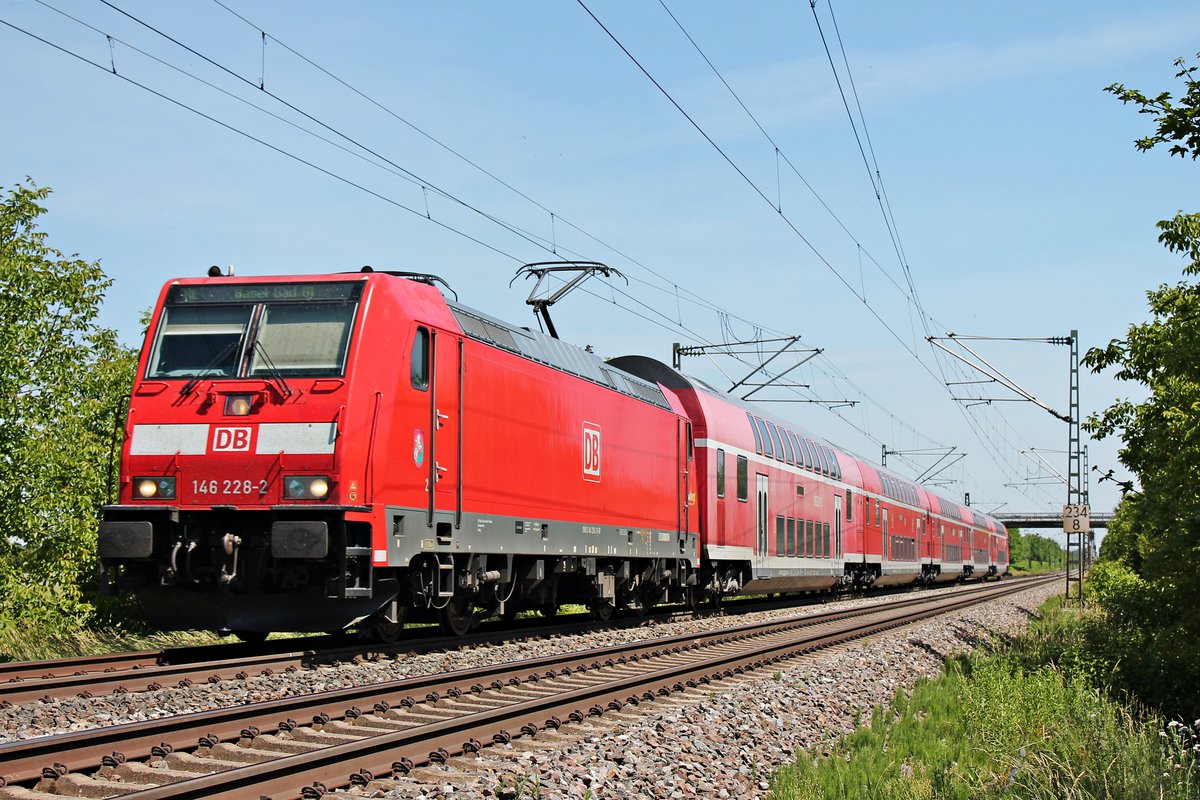 Mit einem RE (Freibrug (Brsg) Hbf - Basel Bad Bf) fuhr am Vormittag des 02.06.2020 die 146 228-2 "St. Georgen" bei Hügelheim über die KBS 702 durchs Markgräflerland in Richtung Müllheim (Baden).