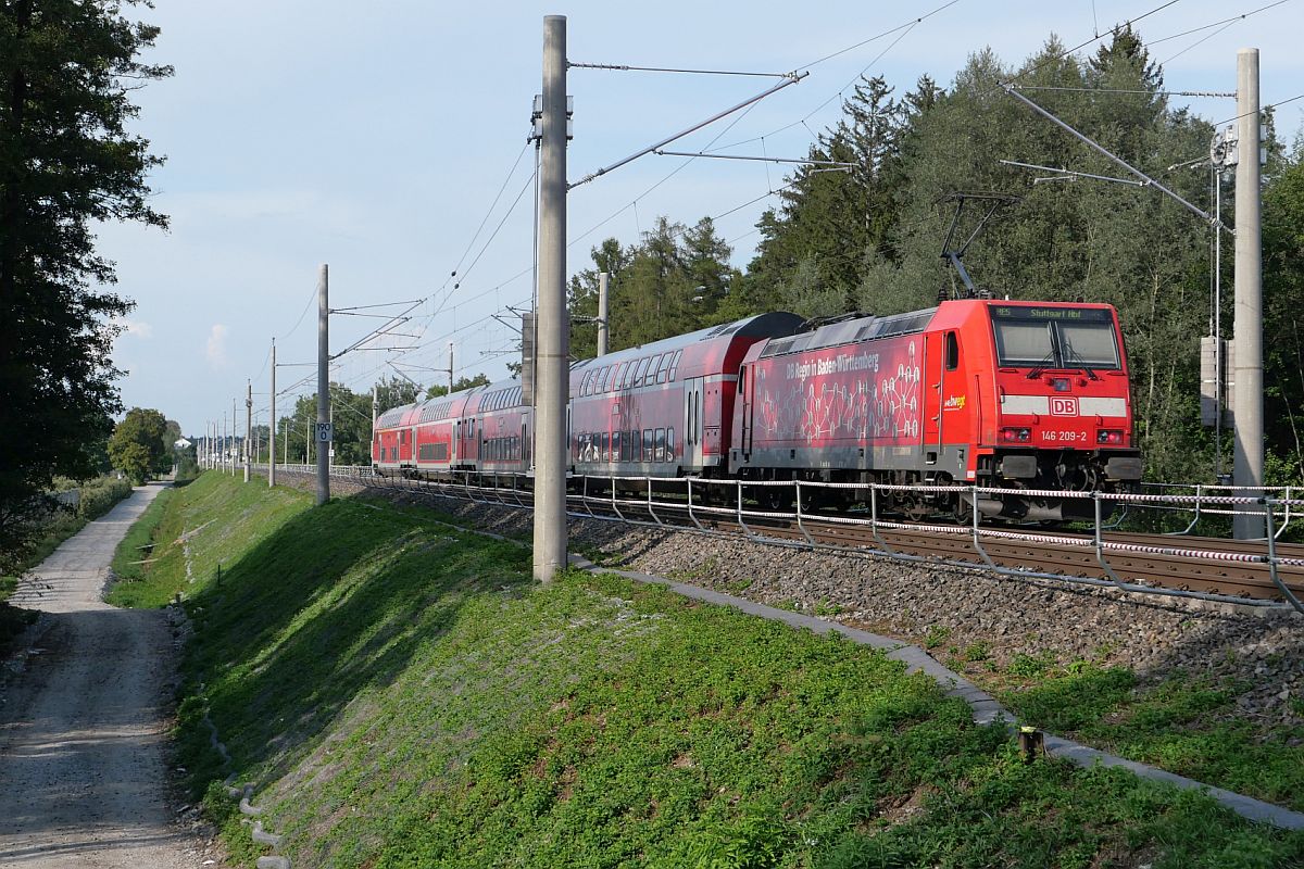 146 209-2 mit den Wagen des RE 5 / 4228, Lindau-Reutin - Stuttgart, am 26.08.2022 kurz vor Meckenbeuren auf einem Bahndamm, an dem bereits teilweise ein Schutznetz angebracht ist, das das Untergraben durch Dachse und damit einen Grundbruch verhindern soll
