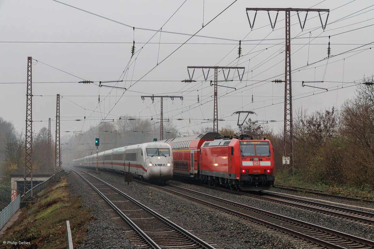 146 020 bringt bei Bochum-Ehrenfeld den RE6 (RE 4318) "WESTFALEN-EXPRESS" von Minden (Westf) nach Düsseldorf. Die Distanz von ca.220 Km legt er in ca. 2:36 Minuten zurück. (05.01.08)