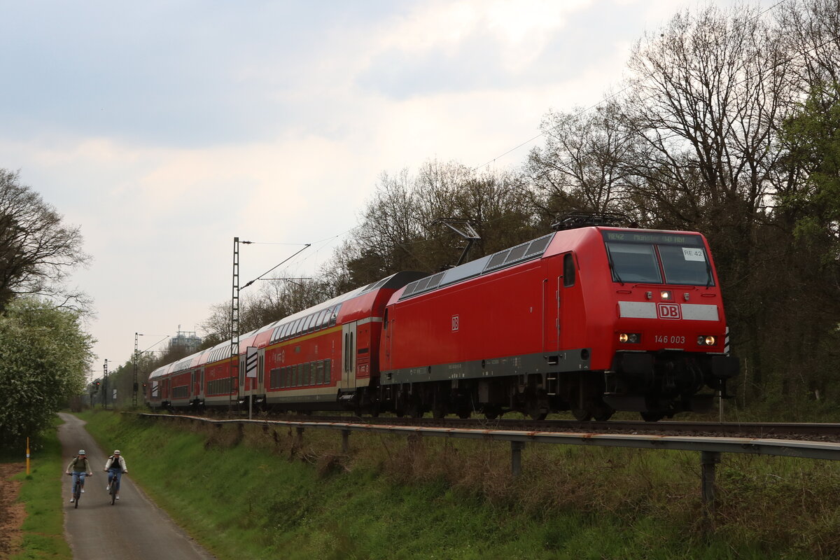 146 003 ist aktuell wieder in ihrer alten Heimat unterwegs, am Abend des 14.4.26 pendelte die Lok auf der Linie RE42 zwischen Münster und Essen. Zum Zeitpunkt der Aufnahme hatte Zug 10157 grade Sythen hinter sich gelassen