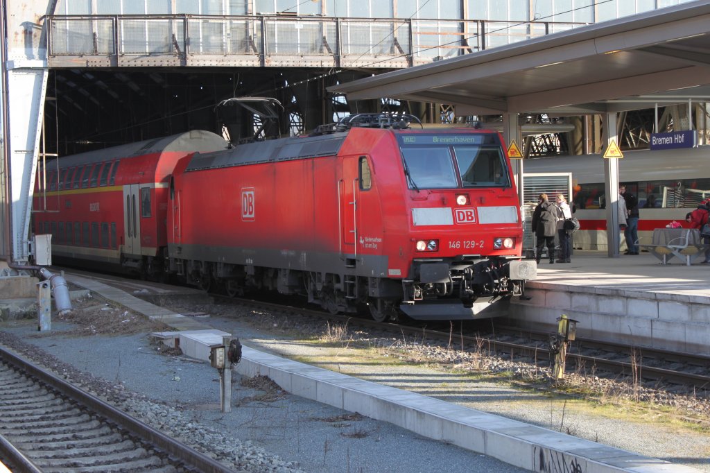 146 129-2 am 24.03.2013 mit RE nach Bremerhaven in Bremen Hbf Gleis 8