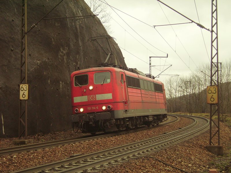 151 114-6 rollt nach getaner Arbeit die Steige hinab in Richtung Geislingen. 22.12.08