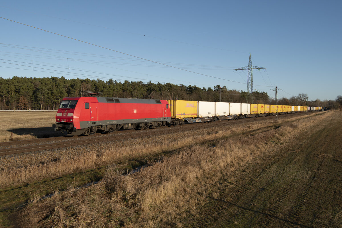 Am 28.12.2025, bei Ahresndorf, fuhr 152 006 mit dem DHL-Zug (Postzug) aus Großbeeren, in Richtung Saarmund, auf dem Berliner Außenring.
