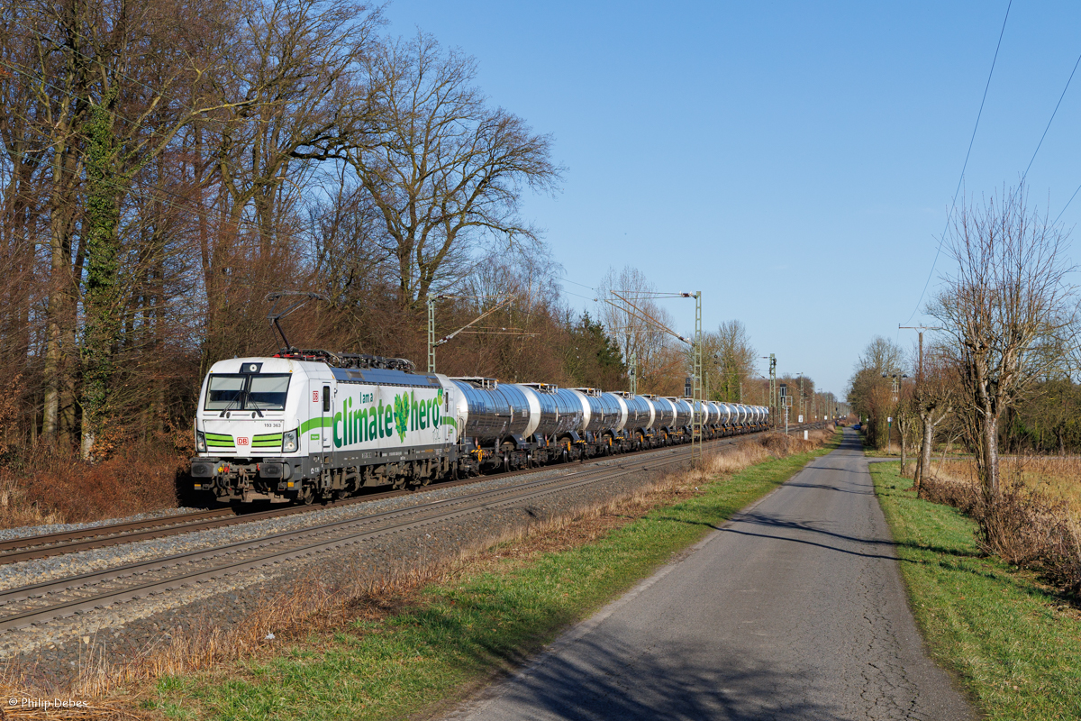 193 363-9  This is green - I am a climate hero  (DB Cargo) mit einem Kesselzug in Senden Bösensell, 25. Februar 2026