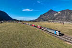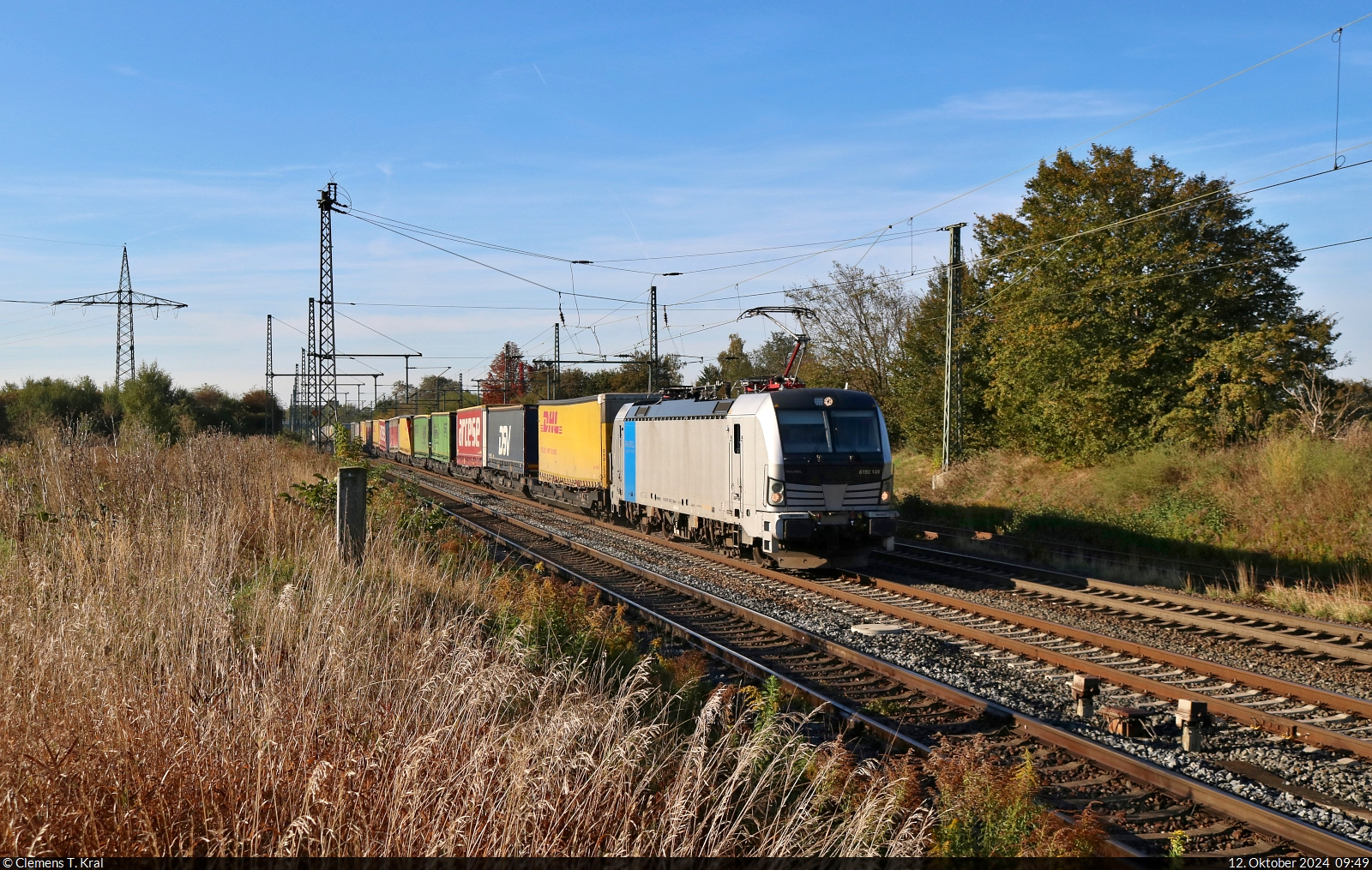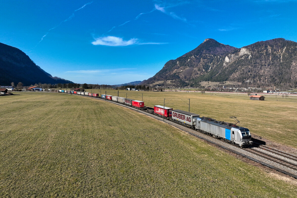 Beim Betrachten dieses Bildes knistert vermutlich Wutbürgers Aluhut. Windräder und dann noch ein neuer G5 Sendemast "verschönern" den ursprünglich einmal malerischen Ausblick auf die kleine Ortschaft Hermannspiegel im osthessischen Haunetal. Günstige Energie und guten Handy-Empfang fordern aber gleichzeitig auch alle - also muss man mit den Konsequenzen leben. Am 21. Juni 2025 konnte ich dort die 193 817 von Retrack mit dem LKW Walter KLV DGS 41146 von Soroksári út rendező in Ungarn nach Wanne-Eickel fotografieren.