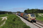 Beim Betrachten dieses Bildes knistert vermutlich Wutbürgers Aluhut. Windräder und dann noch ein neuer G5 Sendemast  verschönern  den ursprünglich einmal malerischen Ausblick auf die kleine Ortschaft Hermannspiegel im osthessischen Haunetal. Günstige Energie und guten Handy-Empfang fordern aber gleichzeitig auch alle - also muss man mit den Konsequenzen leben. Am 21. Juni 2025 konnte ich dort die 193 817 von Retrack mit dem LKW Walter KLV DGS 41146 von Soroksári út rendező in Ungarn nach Wanne-Eickel fotografieren.