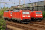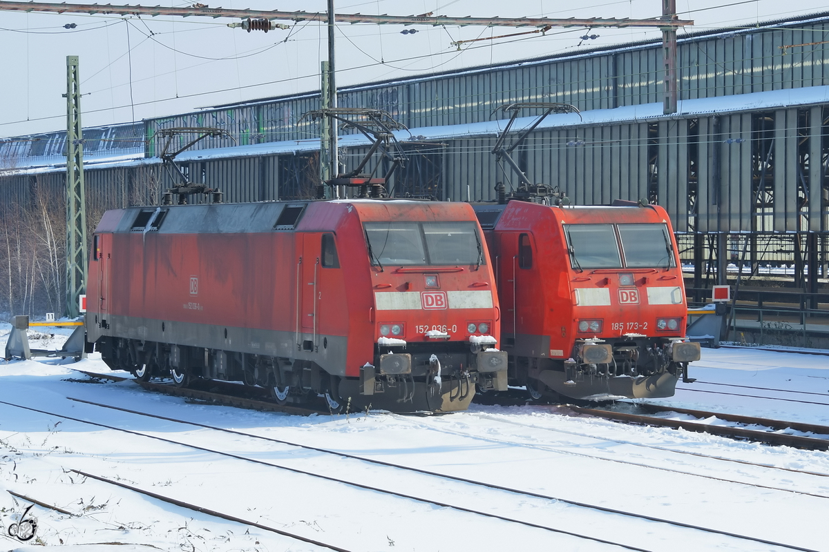 Die Elektrolokomotiven 152 036-0 & 185 173-2 warten am Hauptbahnhof Wanne-Eickel auf den nächsten Einsatz. (Februar 2021)