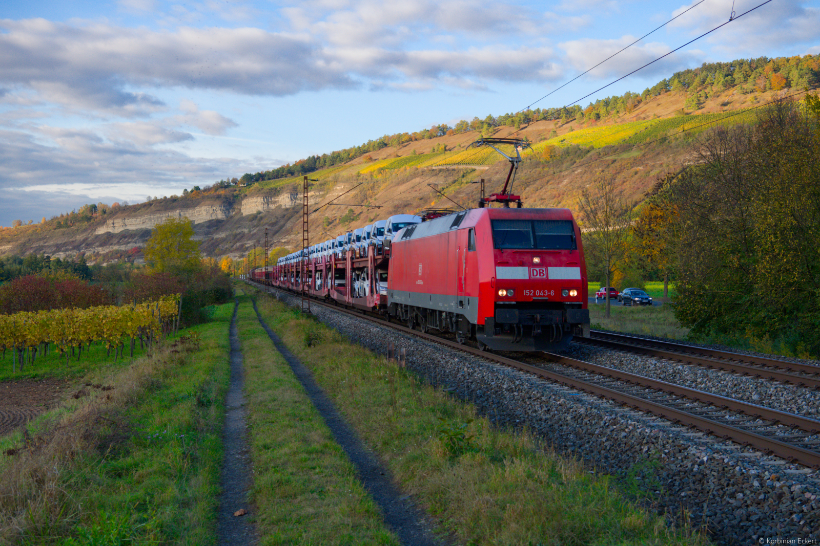 Eine fotogene Leistung ist der KT 50133 von Lehrte Megahub nach Nürnberg Hafen. Der sogenannte DHL-Zug hebt sich gerade bei Landschaftsaufnahmen durch sein überwiegend aus gelben Wechselbrücken bestehendes Ladegut gut ab. Am 18. Juli 2025 wurde er darüber hinaus von der gut gepflegten 152 147 von DB Cargo bespannt. Zwischen Karlstadt und Himmelstadt konnte ich den  Päckchen-Express  aus den Weinbergen heraus in seiner gesamten Länge fotografieren.
