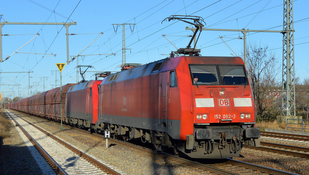 DB Cargo AG [D] mit der Doppeltraktion "152 092-3" [NVR-Nummer: 91 80 6152 092-3 D-DB] + "152 167-3" [NVR-Nummer: 91 80 6152 167-3 D-DB] und dem Erzzug aus Hamburg Richtung Ziltendorf/Eko am 06.01.22 Bf. Golm.