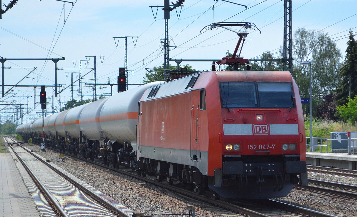 DB Cargo AG [D] mit "152 047-7" [NVR-Nummer: 91 80 6152 047-7 D-DB] und einem Ganzzug Druckgaskesselwagen (Kohlenwasserstoffgas) am 24.06.22 Durchfahrt Bahnhof Golm.