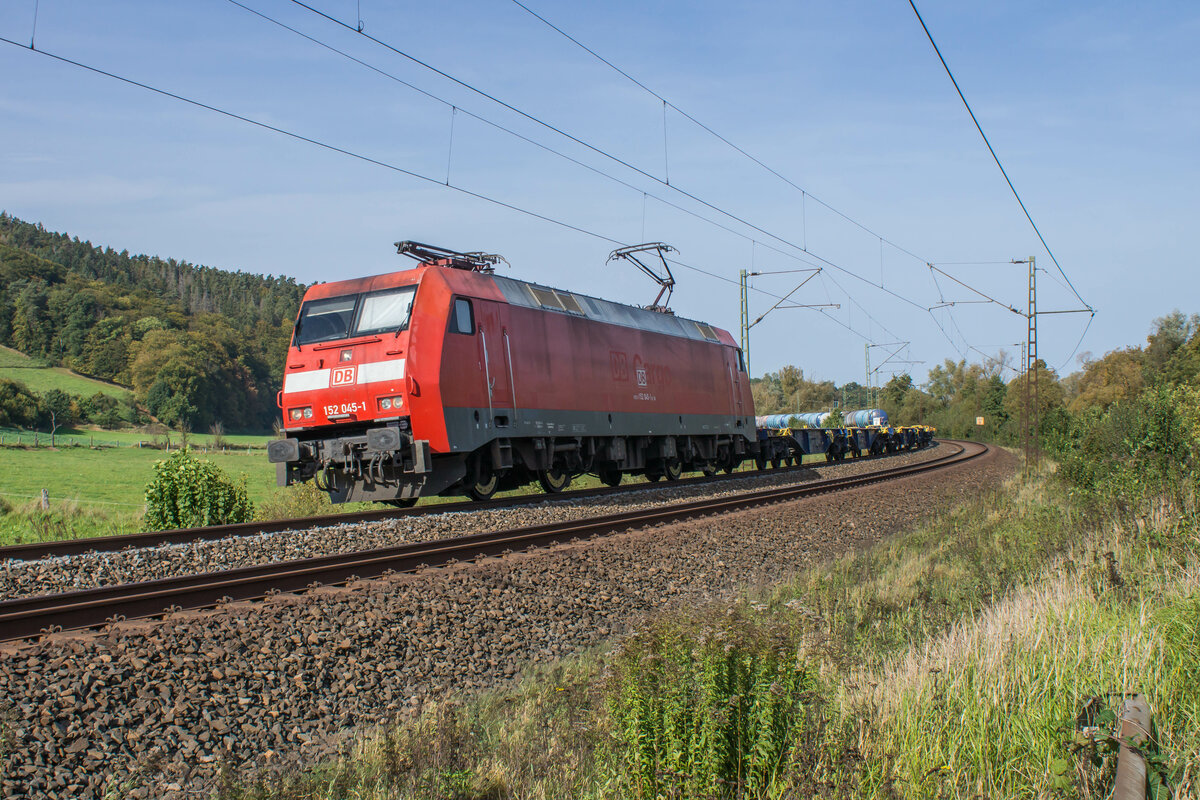 152 165-7 ist mit einem DHL-Zug in Richtung Süden unterwegs,gesehen am 05.11.2025 bei Kerzell.