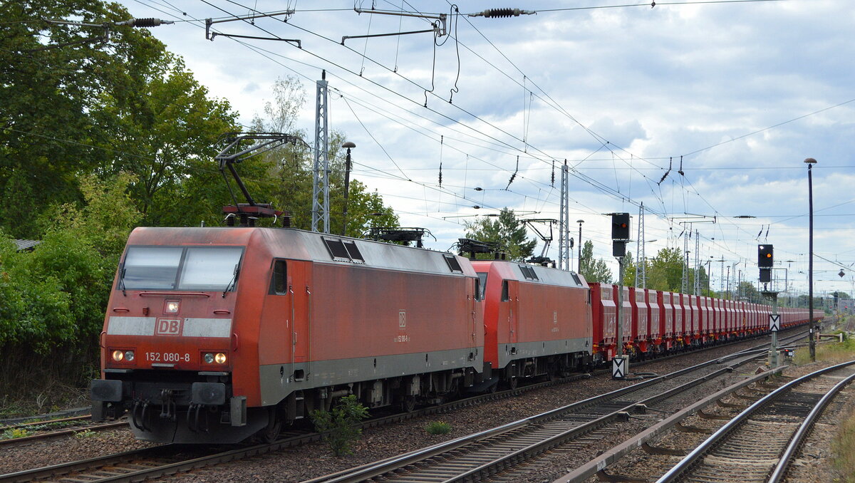DB Cargo AG [D] mit der Doppeltraktion "152 080-8" [NVR-Nummer: 91 80 6152 080-8 D-DB] + "152 113-7" [NVR-Nummer: 91 80 6152 113-7 D-DB] und dem Erzzug aus Hamburg Richtung Ziltendorf EKO am 01.09.22 Berlin Hirschgarten.