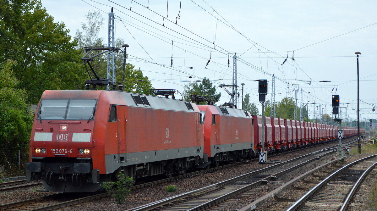 DB Cargo AG [D] mit der Doppeltraktion "152 076-6" [NVR-Nummer: 91 80 6152 076-6 D-DB] + "152 158-2" [NVR-Nummer: 91 80 6152 158-2 D-DB] und der Erzzug aus Hamburg am 07.09.22 Richtung Ziltendorf EKO in Berlin Hirschgarten.