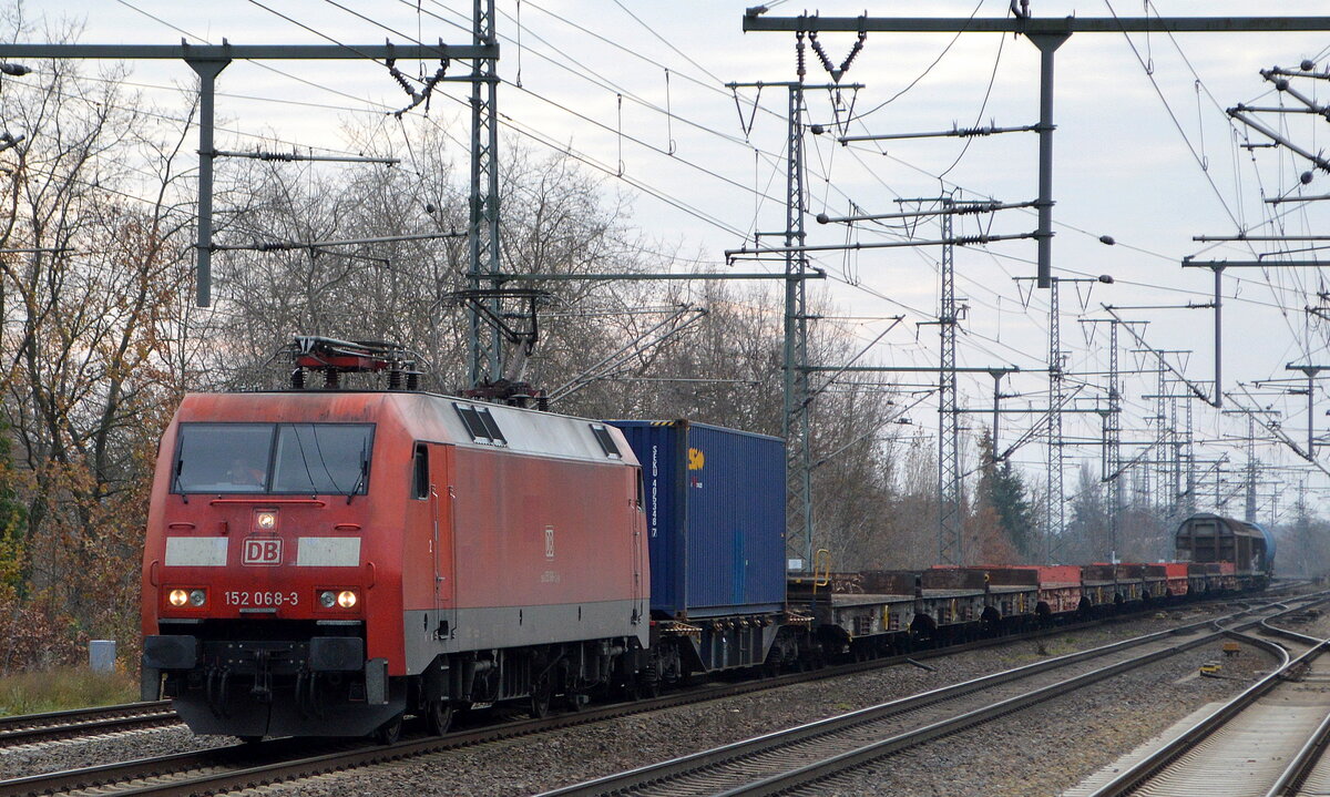 DB Cargo AG [D] mit "152 068-3" [NVR-Nummer: 91 80 6152 068-3 D-DB] und einem gemischten Güterzug bei der Durchfahrt Bahnhof Golm, 30.11.22