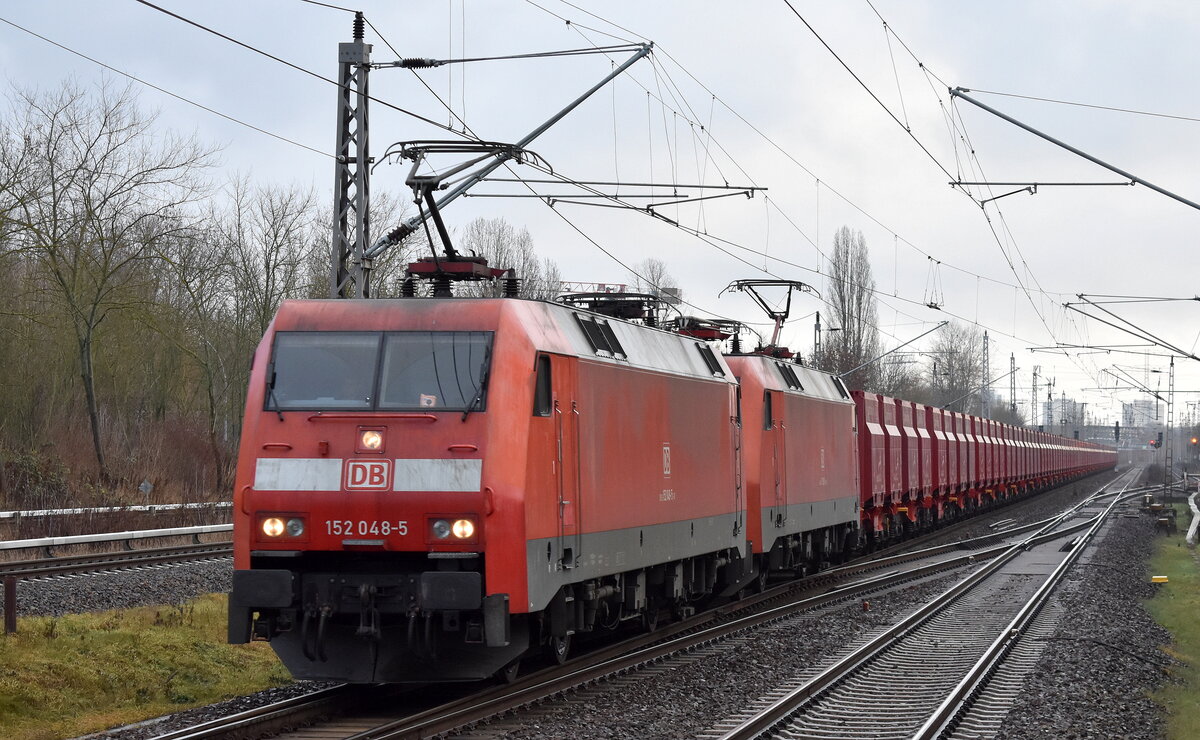 DB Cargo AG [D] mit der Doppeltraktion "152 048-5" [NVR-Nummer: 91 80 6152 048-5 D-DB] + "152 091-5" [NVR-Nummer: 91 80 6152 091-5 D-DB] und dem entleerten Erzzug aus Ziltendorf EKO Richtung Hamburg am 23.12.22 Durchfahrt Bahnhof Berlin Hohenschönhausen.