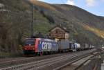 DB Cargo 152 040 mit KLV-Zug in Richtung Rüdesheim. Im Hintergrund ist die Burg Gutenfels zu sehen (Kaub, 10.03.2017).